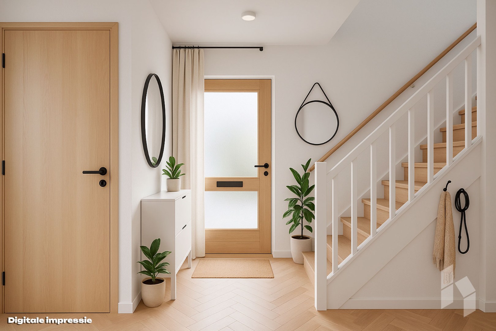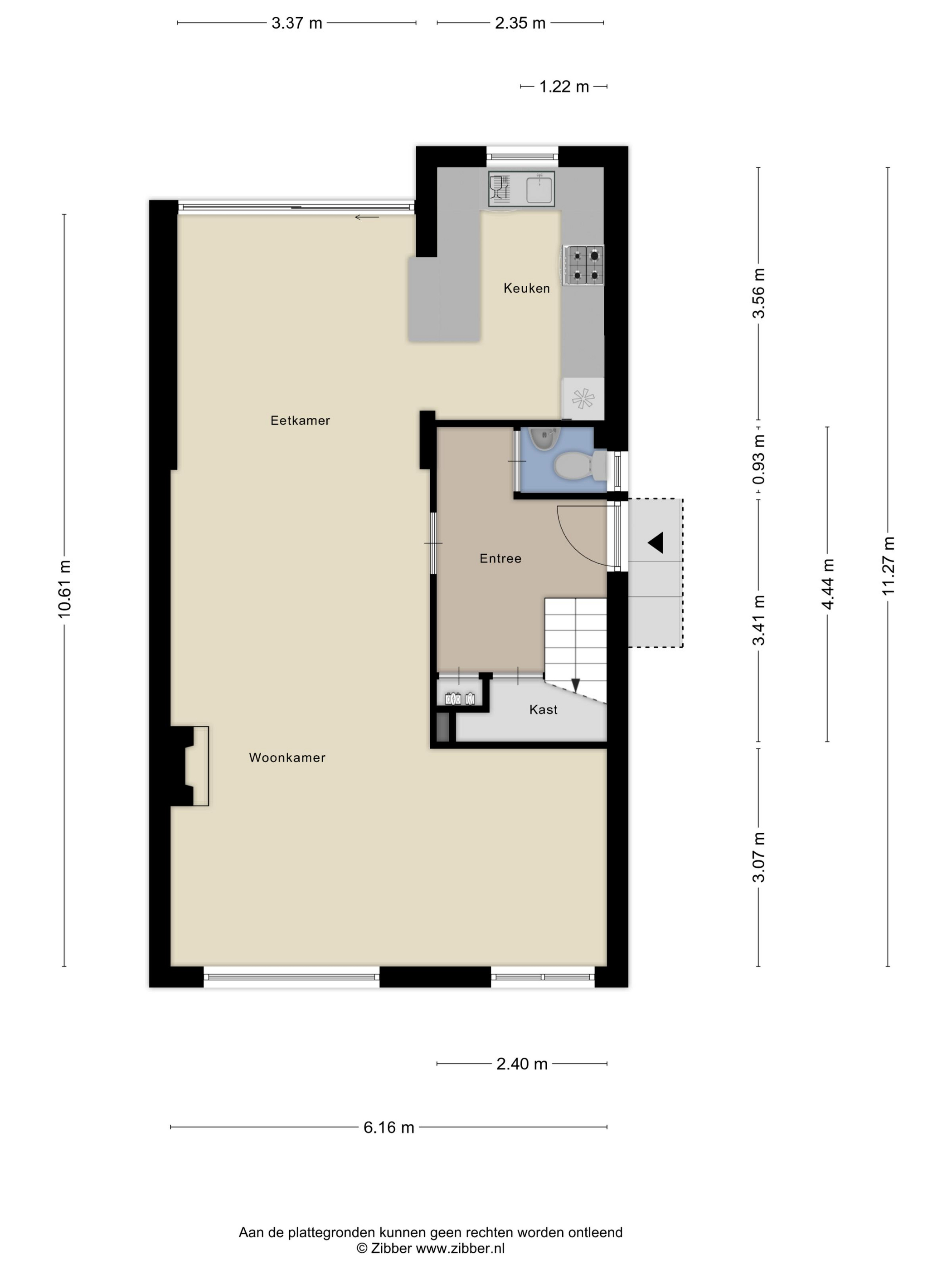 Begane grond: entree-hal, toilet, woonkamer, open keuken, terras/betegelde tuin met achterom